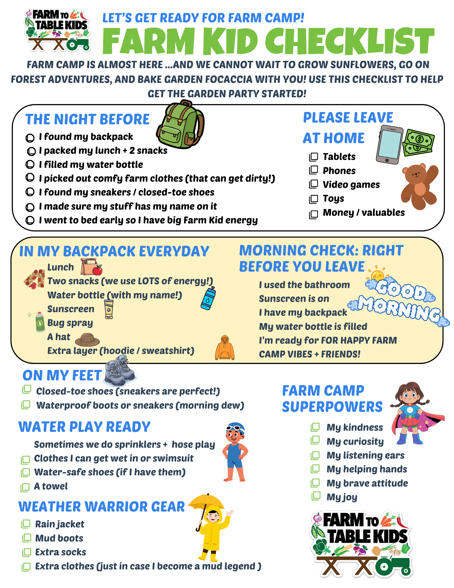 Print-out and use this CHECKLIST from Farmer Steph to GET READY FOR FARM CAMP!